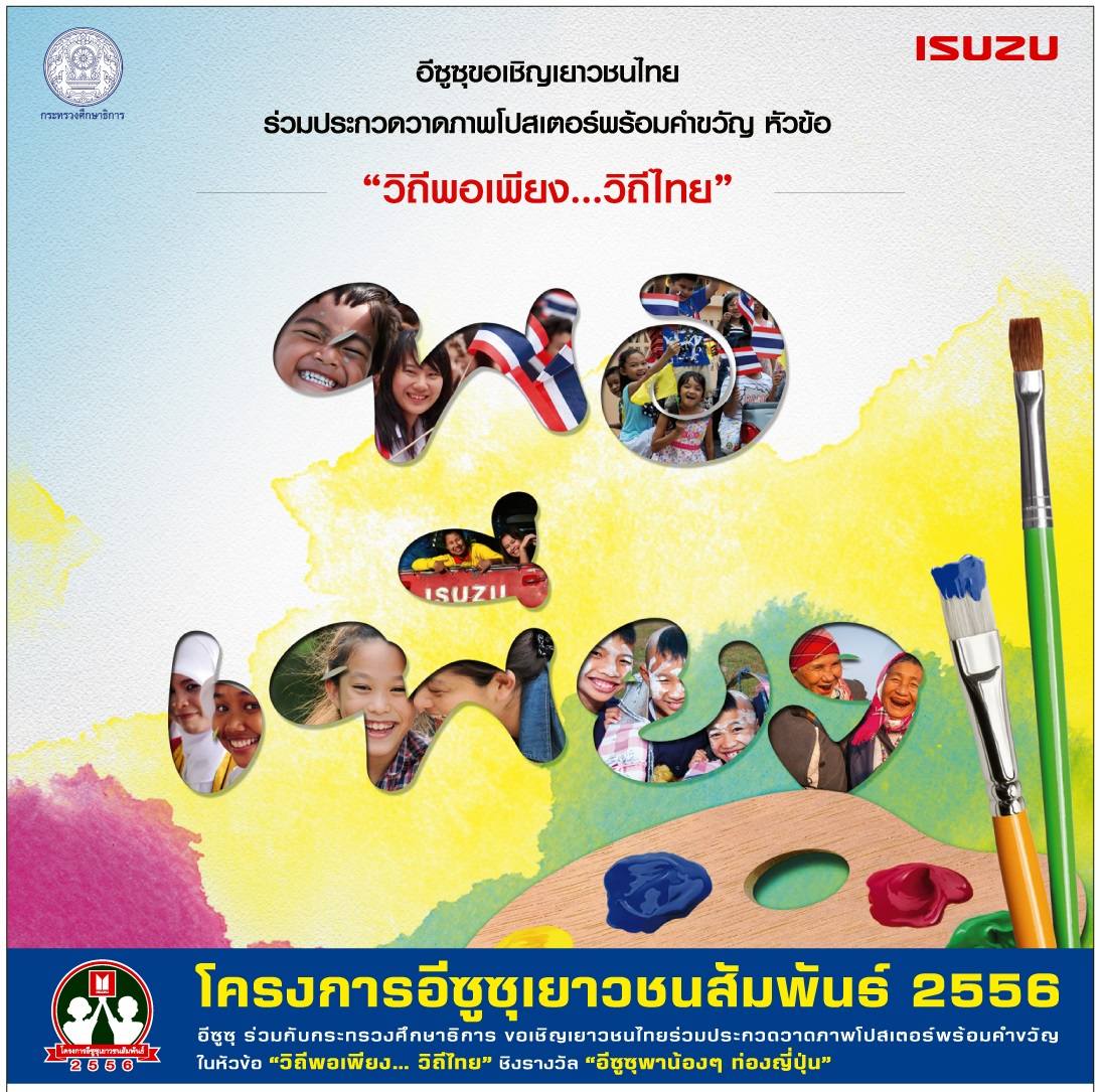 บริษัท ตรีเพชรอีซูซุเซลส์ จำกัด โดยการสนับสนุนจากสำนักพระราชวังและกระทรวงศึกษาธิการ จัดงานแถลงข่าวกิจกรรมประกวดวาดภาพโปสเตอร์พร้อมคำขวัญ โครงการ “อีซูซุเยาวชนสัมพันธ์” ประจำปี พ.ศ. 2556 สานต่อปณิธานของพระบาทสมเด็จพระเจ้าอยู่หัวฯ ปลูกฝังคุณธรรมพื้นฐานในการดำรงชีวิตตามหลักเศรษฐกิจพอเพียง ด้วยการเชิญชวนเยาวชนไทยทั่วประเทศร่วมส่งผลงานศิลปะในหัวข้อ “วิถีพอเพียง…วิถีไทย” เพื่อลุ้นเข้าสู่รอบตัดเชือก ชิงรางวัล “อีซูซุพาน้องๆ ท่องญี่ปุ่น” เปิดประสบการณ์ในเมืองแห่งเทคโนโลยีและวัฒนธรรมดั้งเดิมแห่งโลกตะวันออก ณ ประเทศญี่ปุ่น ฟรี! พร้อมรับโล่ประกาศเกียรติคุณและทุนการศึกษาอีกมากมาย